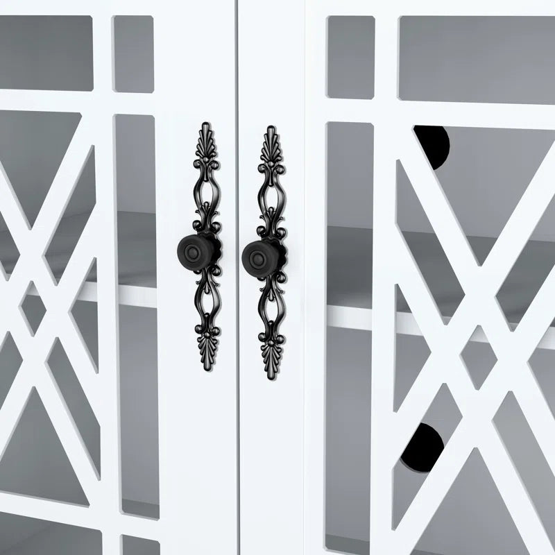 Blending French country charm with functional storage, the Beaumont Sideboard is a timeless addition to your dining or living room. Crafted from solid and engineered wood with a neutral finish and crown molding, it rests on classic turned feet for a refined silhouette. The four glass doors feature decorative inlays that open to reveal generous shelving, perfect for dishes, books, or media items. A contrasting top surface provides space for serving trays, décor, or fresh flowers, making the Beaumont as practical as it is stylish.