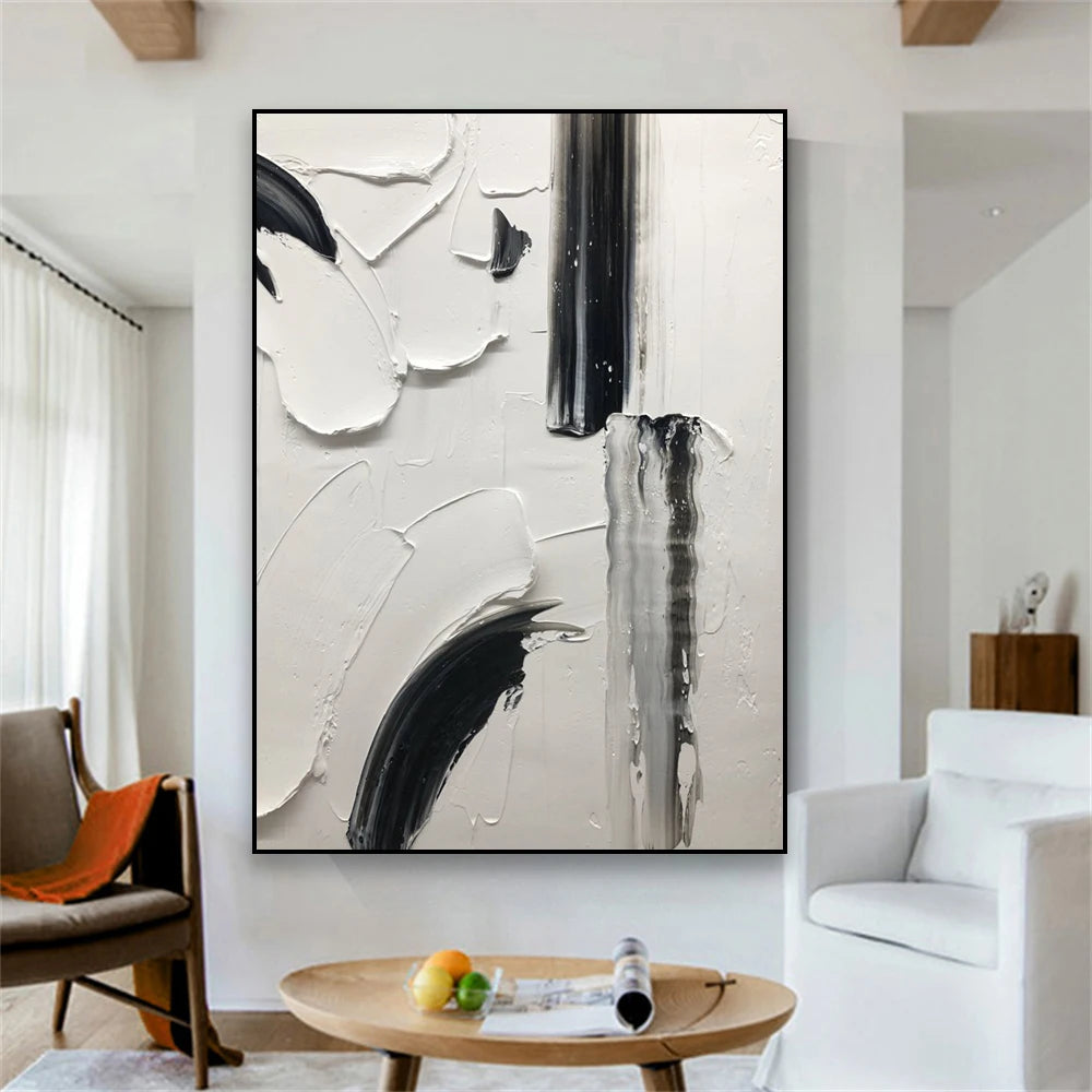 The Civaro Canvas contrasts bold black strokes with layered white textures, embodying modern abstract expression. Its striking composition creates visual drama, perfect for contemporary or minimalist interiors.