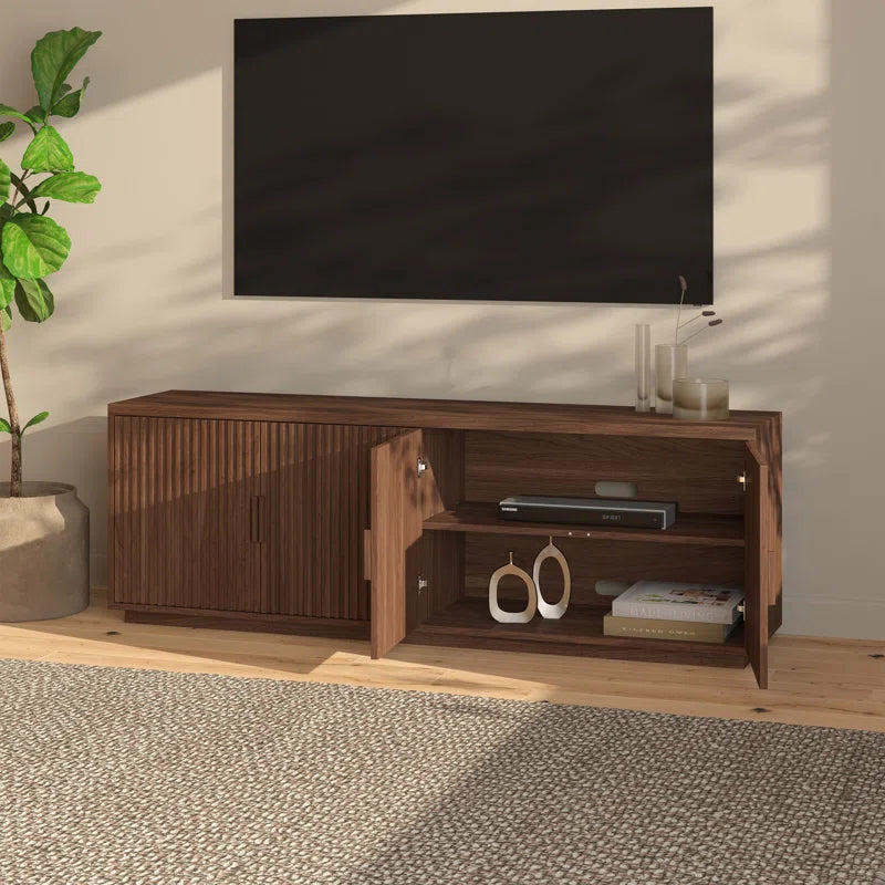 The Daxel TV Stand blends sleek modern design with practical functionality, making it a refined anchor for your entertainment setup. Four swing-out doors with vertical fluting create a textured, architectural look, while hidden handgrips maintain a clean, uninterrupted surface. Inside, adjustable shelves provide versatile storage for consoles, media, and accessories. A plinth base adds stability and smooth lines from top to bottom, while cable management cutouts keep wires neatly tucked away. With its minimalist profile and warm wood finish, the Daxel elevates any living room with understated sophistication.