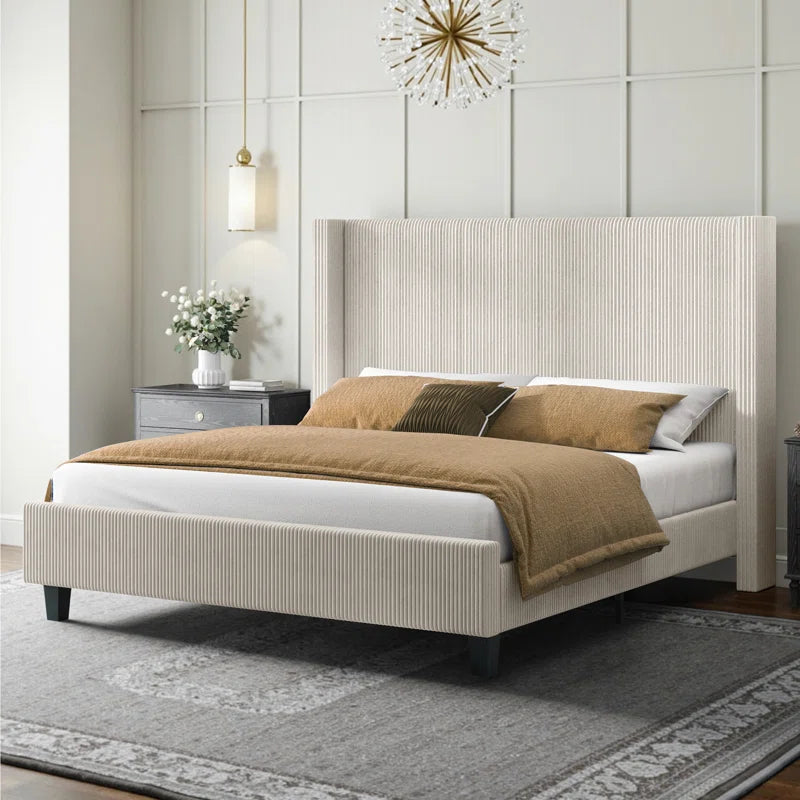 Give your bedroom a modern twist on classic design with this corduroy-upholstered platform bed. Its wingback-style headboard is wrapped in ribbed corduroy fabric and padded with foam for extra comfort while reading or relaxing. A solid wood and metal frame provides strength, while tapered front legs add sleek, contemporary flair. With slats and center supports included, this bed eliminates the need for a box spring. Both stylish and functional, it’s a statement piece designed for lasting comfort.