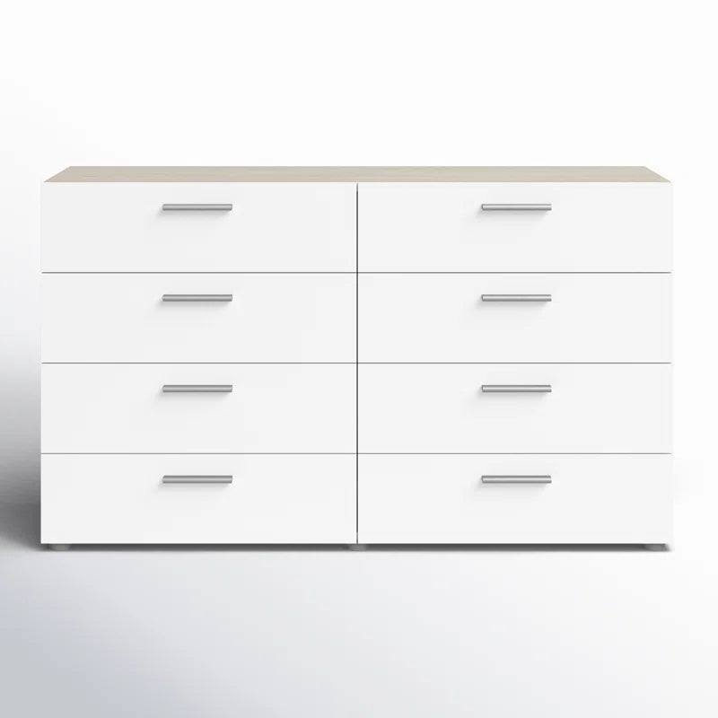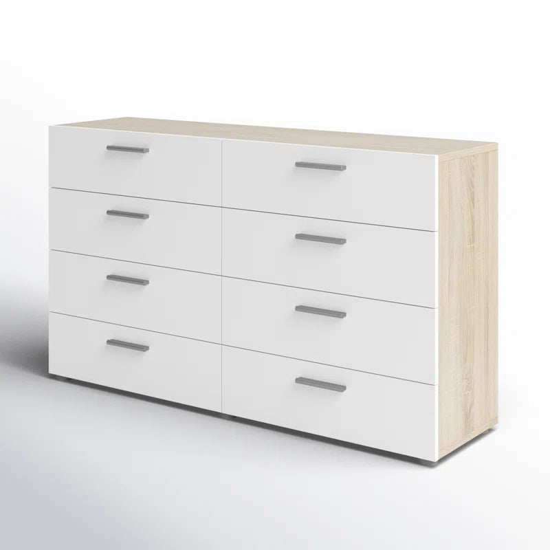 A sleek and spacious dresser designed to bring both function and elegance to your bedroom. With eight smooth-gliding drawers, it provides ample storage for clothing, linens, and essentials. The wide top surface is ideal for décor, lamps, or flowers. Crafted from engineered wood in a versatile neutral finish, it blends seamlessly into modern or classic interiors. Wall-mounting hardware is included for added stability and peace of mind, making it as practical as it is stylish.