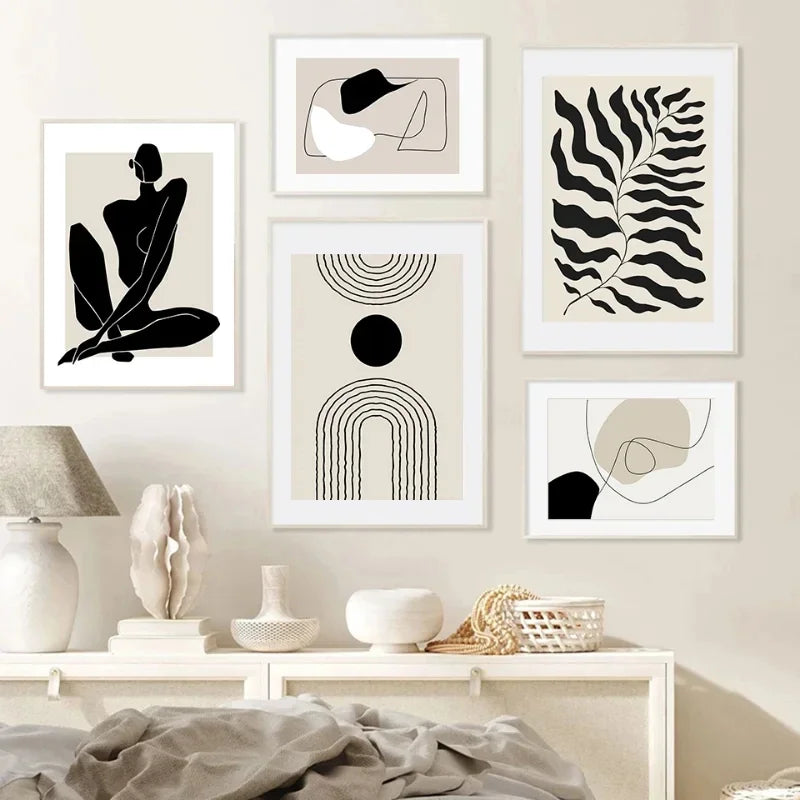 The Lyora Prints combine organic botanical motifs with striking geometric patterns, offering a versatile set of contemporary wall art. Each piece layers texture and contrast to create a gallery-worthy display, perfect for modern and Scandinavian-inspired interiors.