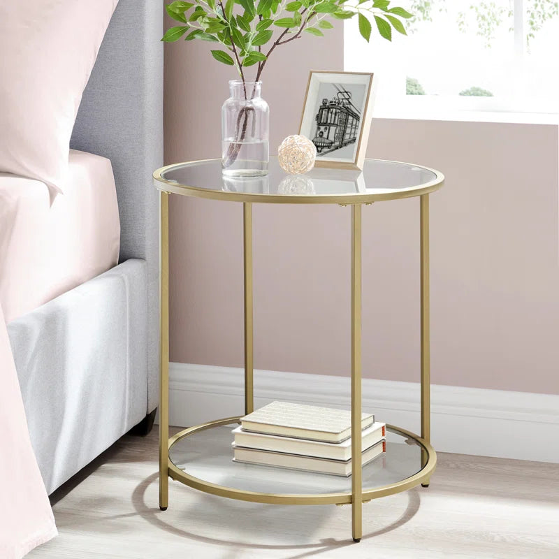 The Lyra End Table adds a touch of refined glam to any room with its airy silhouette and gleaming gold finish. Its slim round frame supports a clear glass top and a lower shelf, offering the perfect balance of style and function. Compact yet versatile, the Lyra works beautifully beside a sofa, next to a bed, or as an accent in a reading nook. Adjustable feet ensure stability on uneven floors, while its open design keeps the look light and modern. Both chic and practical, Lyra is an effortless addition to contemporary living.