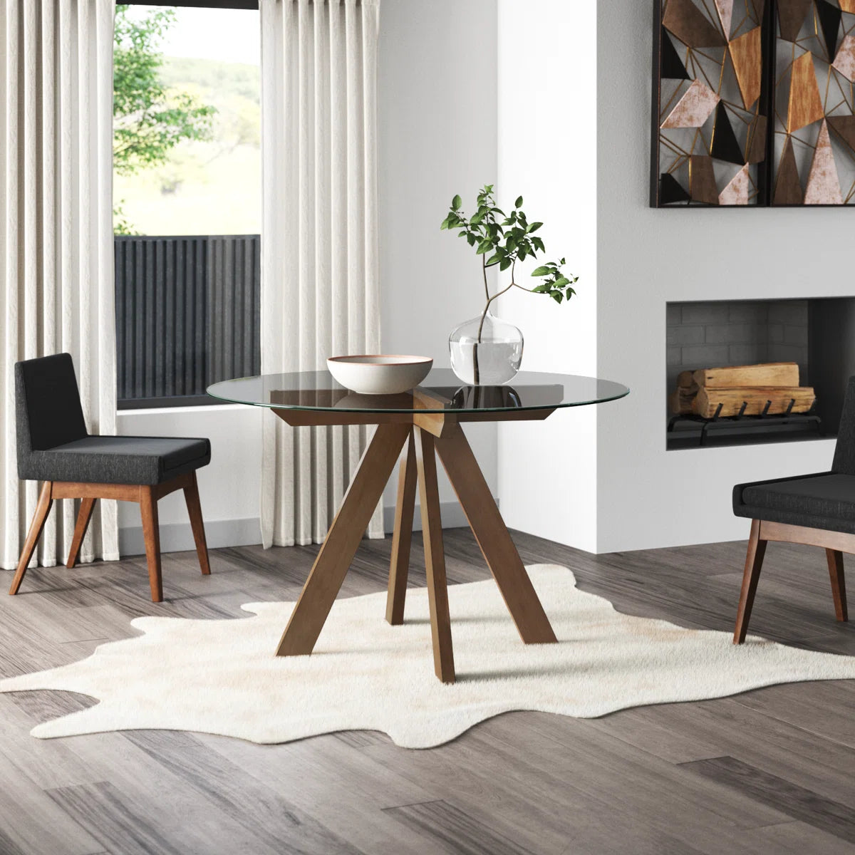 Bring a modern yet rustic touch to your dining space with this round glass dining table. Featuring a tempered glass top for easy cleaning and a pedestal-inspired solid wood base with angled legs, it strikes the perfect balance of style and durability. The warm mocha finish highlights the wood’s natural grain, creating a welcoming centerpiece for casual meals, coffee chats, or weekend brunches. At 4 feet in diameter, it comfortably seats four people, making it ideal for intimate gatherings and everyday use.