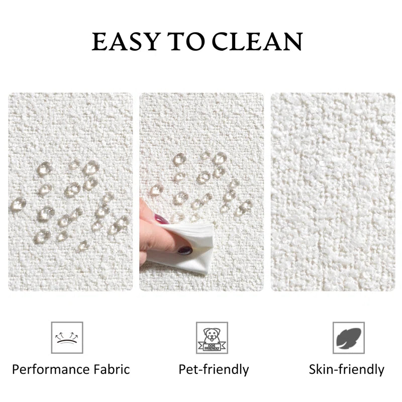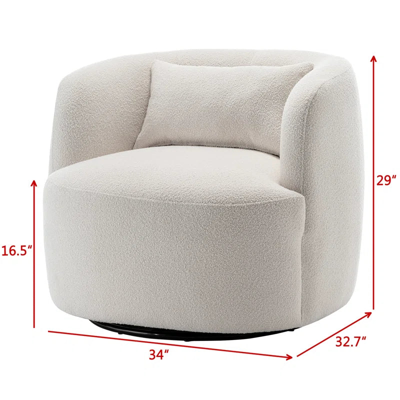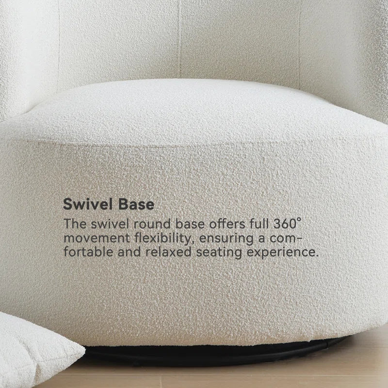 The Syra Swivel Armchair is a cozy retreat designed for relaxation and versatility. With its rounded base, recessed arms, and smooth 360° swivel, this low-profile chair invites you to unwind in comfort while adding a modern touch to any space. Upholstered in soft bouclé fabric, it blends tactile luxury with everyday durability. A removable lumbar pillow provides added support, while the sturdy iron base ensures lasting stability. Perfect for reading nooks, bedrooms, living rooms, or family spaces, the Syra chair delivers comfort and style from every angle